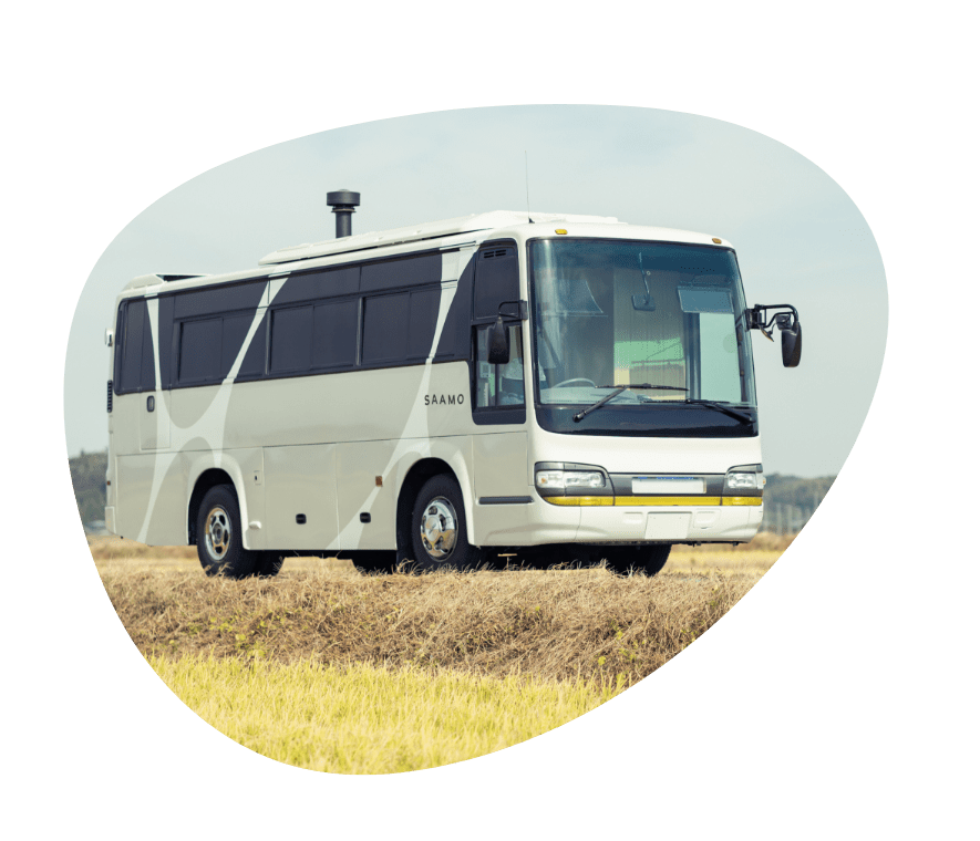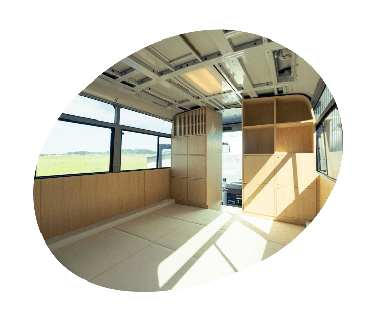 観光バスの特徴である車両下の大きな貨物空間を活かして給水・排水のタンクや給湯設備・チラーなど設置することで、オフグリッド環境でも機能するようになっています。 窓から眺望として観光バス特有の高さのある景色を楽しむことができます。